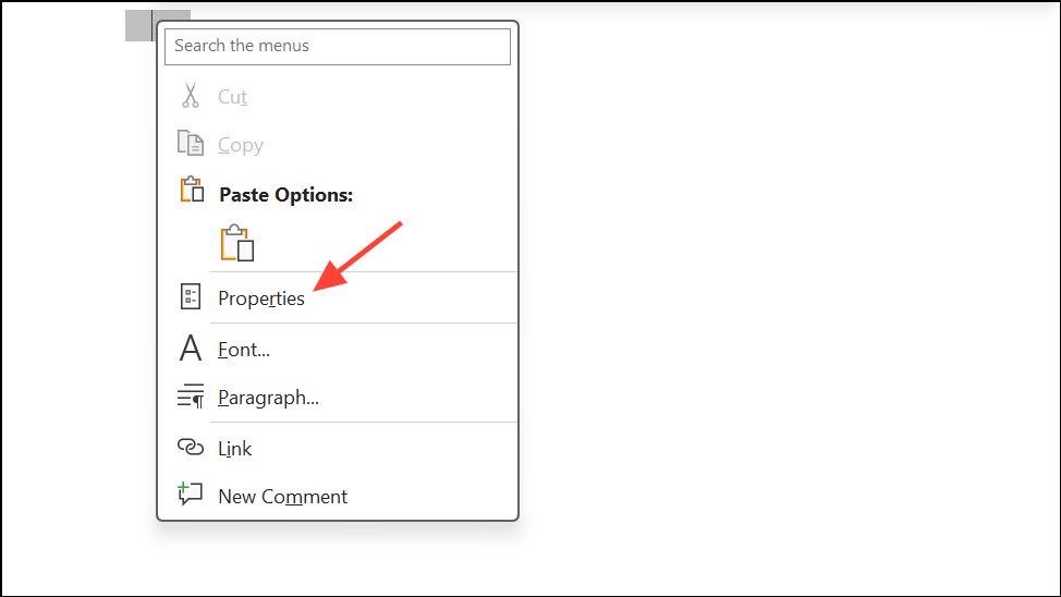 Step 3: The field will appear as a small gray box. Right-click it and select Properties to set options such as default text, maximum length, and assign a bookmark name for mail merge or automation.
