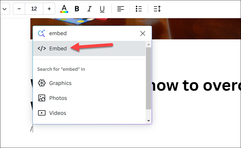 Then, go to the place in the document where you want to insert the YouTube video. Press / on your keyboard to open the Magic menu and type embed and select it from the options.