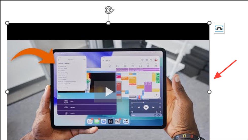 Step 5: Click on the video in your document to select it. You can use the handles to resize, rotate, or move the video as needed. To play the video, click the play arrow directly on the video object. The video will expand and play within the document, provided you have an active internet connection.