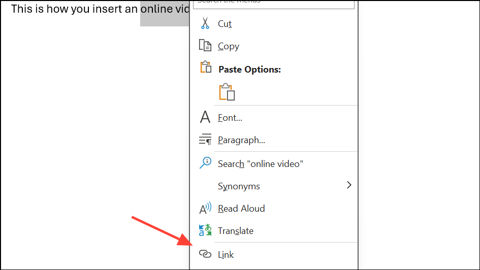 Step 2: In your Word document, select the text or object you want to turn into a clickable link. Right-click and choose Link (or click Insert > Link in the ribbon). Paste the video URL into the address field and confirm.