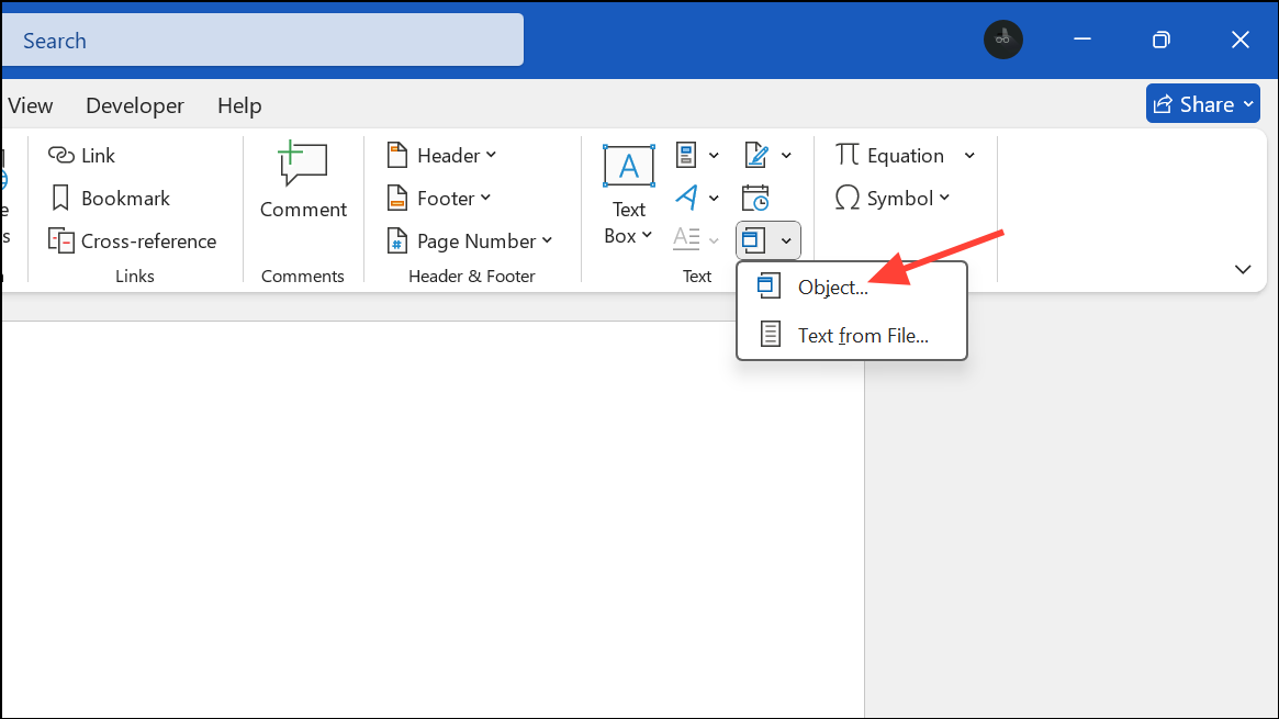 Step 1: If you want to include a video stored on your computer (not online), go to the Insert tab and click Object in the Text section.