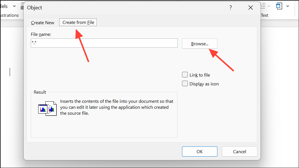 Step 2: In the Object dialog box, switch to the Create from File tab. Click Browse and select your video file. To embed the video file directly into the document, simply click OK. To link instead of embedding (which keeps the Word file smaller), check the Link to File box before clicking OK.
