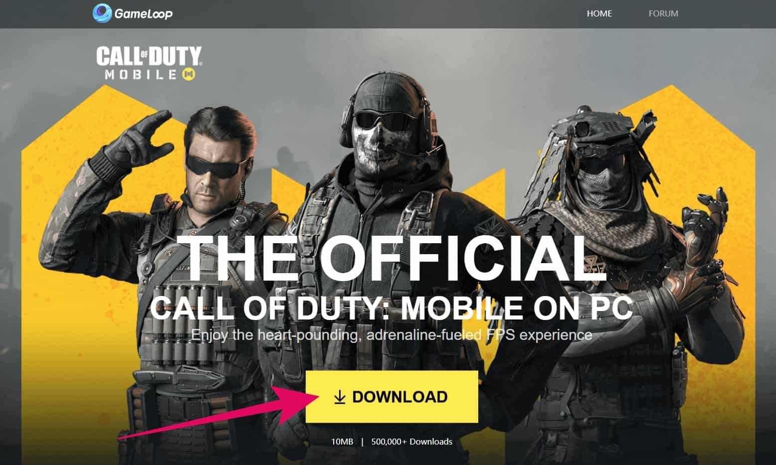 To get started, visit Gameloop in a browser on your PC and hit the big yellow download button on the page to get the COD: Mobile PC installer by Gameloop.