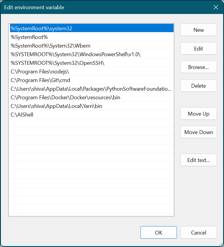 To do this, search for "environment variables" in the Windows search bar, click "Edit the system environment variables," and then select "Environment Variables." Under "System variables," select "Path," click "Edit," click "New," and add the full path to the extracted folder (e.g., C:\AIShell), then save it.