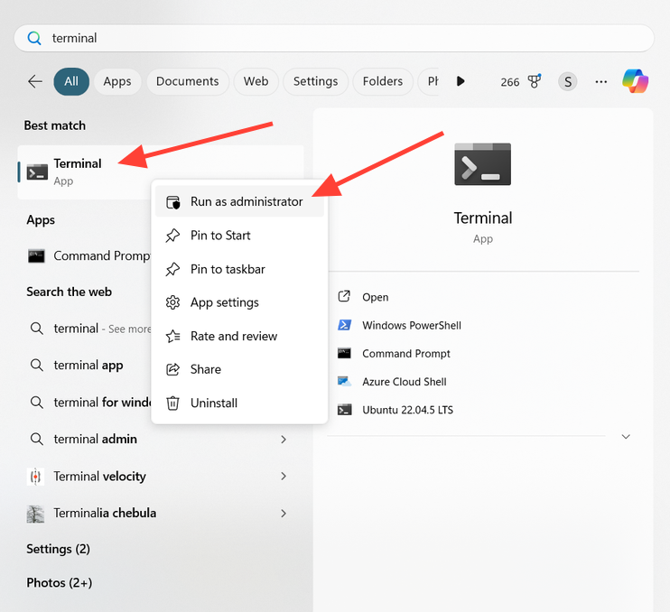 Step 1: Open Terminal as an administrator. You can do this by pressing the Win key, typing "Terminal," right-clicking on "Terminal," and selecting "Run as administrator".