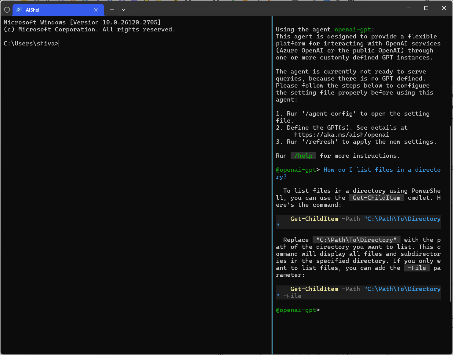 You can interact with AI Shell by typing questions or commands in the AI Shell pane. To direct a command to a specific agent, use the syntax @<agentName> followed by your query. For instance, @openai-gpt "How do I list files in a directory?" will send that question to the Azure OpenAI agent. The initial selection of the agent will be done by the prompt when you run the command Start-AIShell.