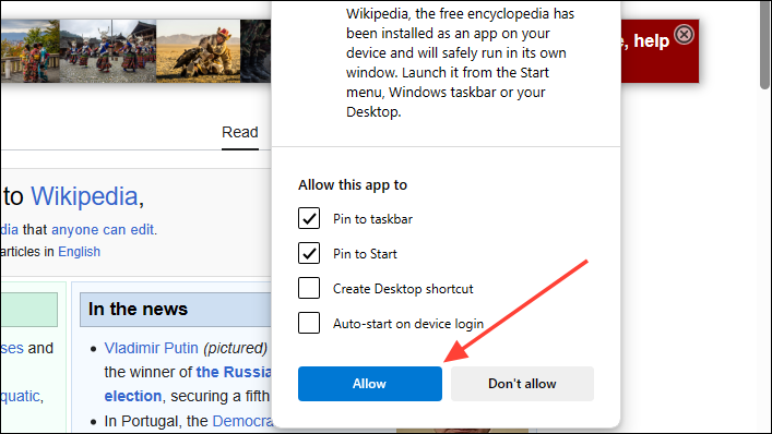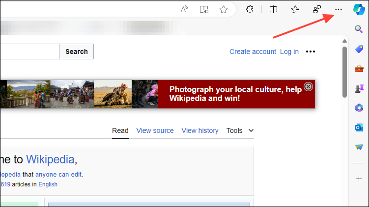 - Launch the Edge browser and go to the website you want to install as an app, such as Wikipedia.