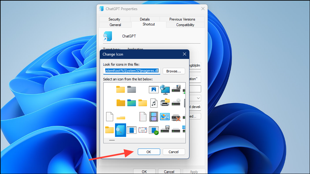 - You can use a custom icon from your images library on the system, or choose one from the Windows library by navigating to this address 'C:\Windows\System32\imageres.dll'.