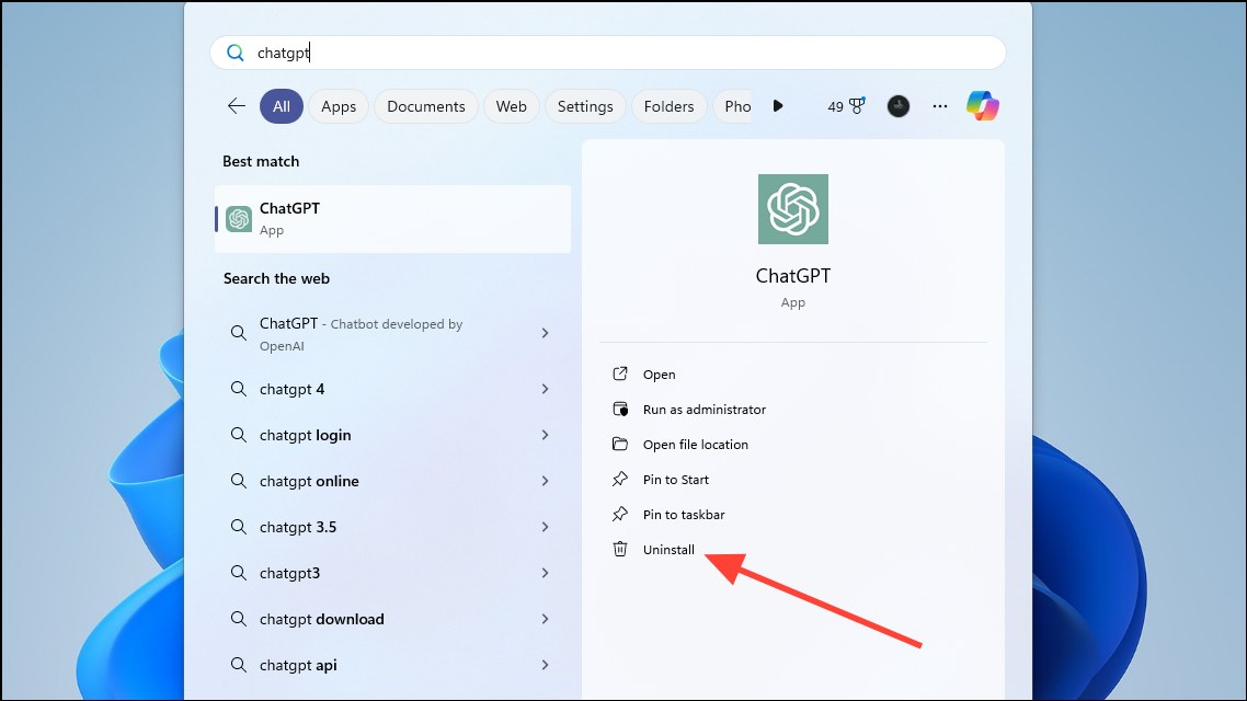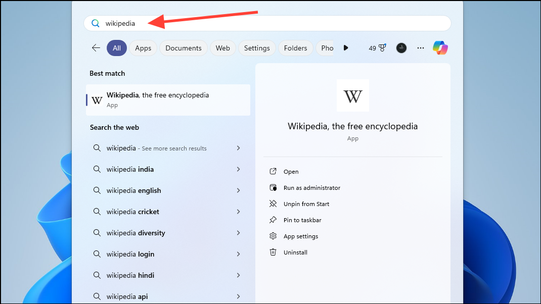 - Open the Start menu and search for the website you installed as an app, which in this case can be ChatGPT or Wikipedia.