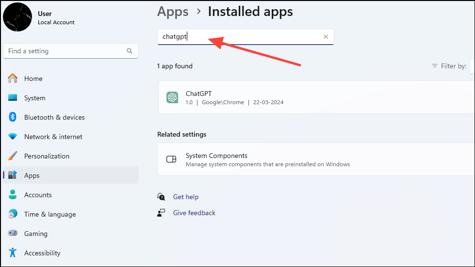 - Search for ChatGPT in the search box on the Settings page.