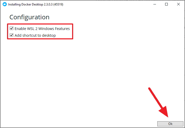 You will be presented with a configuration window in the setup process. Tick ‘Enable WSL 2 Windows Features’ if you are on Windows 10 Home edition or want to use Docker’s WSL 2 backend and Tick ‘Add shortcut to desktop’ if you want Docker Desktop shortcut, then press ‘Ok’ to begin the installation.