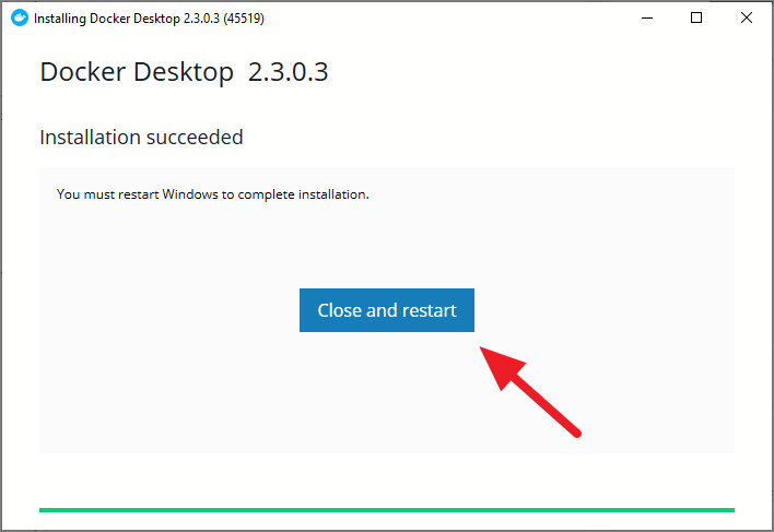 Once the Docker Desktop setup finished unpacking and installing the files, click on the ‘Close and restart’ button to complete the docker installation process.