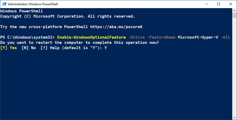 PowerShell will prompt you to restart the computer to complete Hyper-V installation, type Y and hit enter to do the same. After rebooting the computer, you can run Docker Desktop and use containers.