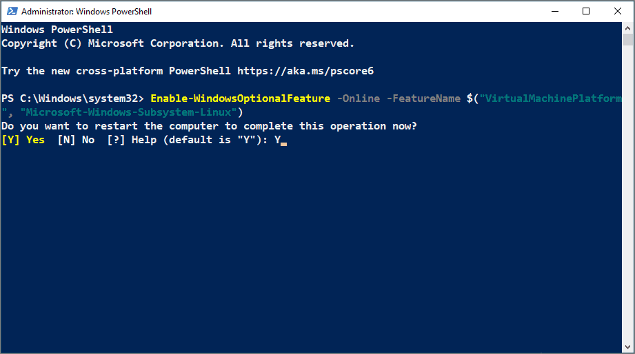 Enable-WindowsOptionalFeature -Online -FeatureName $("VirtualMachinePlatform", "Microsoft-Windows-Subsystem-Linux")