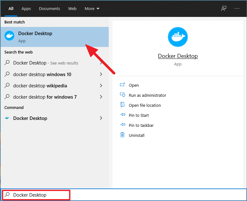 Once you’ve enabled and updated the WSL for Windows 10, you can run Docker searching for it in the Start menu.