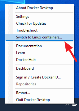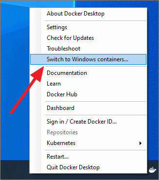 Switch to Hyper-V backend by going to the Docker system tray icon, right-clicking on it and selecting ‘Switch to Windows containers’ option. Similarly, you can switch to WSL backend by selecting ‘Switch to Linux containers’ option.