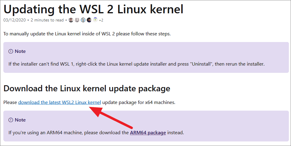 Click on this link or link in the error to go to Microsoft Docs page with the latest WSL2 kernel update. Then click on ‘download the latest WSL2 Linux kernel’ link on the page as shown below to download ‘wsl_update_x64’ setup file.