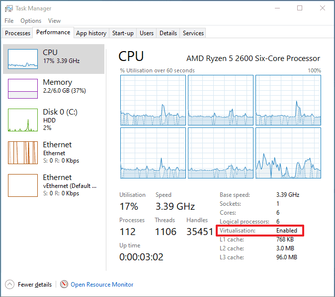 In addition to the above requirements, you need virtualization support enabled in the BIOS. To check if you already have virtualization enabled, open the Task Manager and go to the Performance tab.