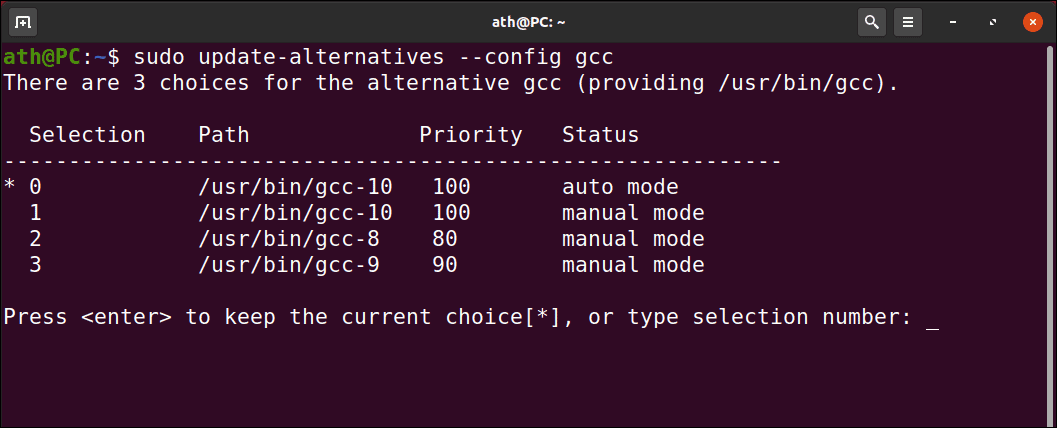 You will be presented with the list of all the GCC versions installed on your Ubuntu System. Change the default GCC version by typing in the number corresponding to it.