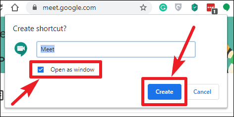 Step 4: A dialog box will appear. By default, the shortcut will be named "Meet." You can rename it if you prefer. Make sure to check the box next to Open as window to ensure the app opens in a separate window like a regular application. Then, click Create.