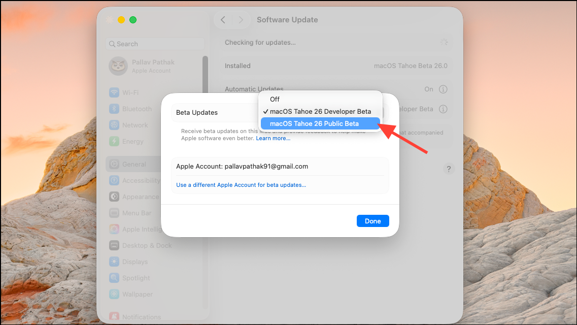 Step 4: In the Beta Updates menu, turn on Beta Updates if they’re not already enabled. From the dropdown, select macOS Tahoe 26 Public Beta. If you don’t see this option, double-check that your Apple ID is properly enrolled in the beta program and that you’re using a compatible Mac model.