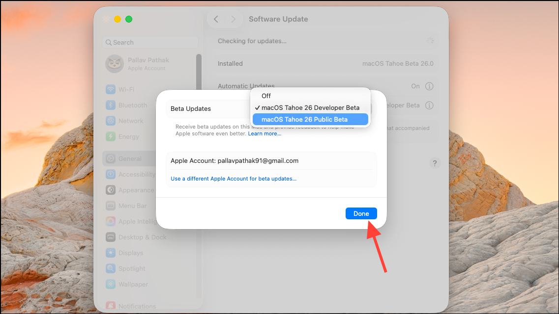 Step 5: Click Done. Your Mac will now check for updates and display the macOS Tahoe 26 Public Beta as an available upgrade. Click Upgrade Now to begin the download and installation process. The Mac will restart after installation, and you’ll be greeted by the new macOS Tahoe setup.