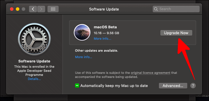 After installing the macOS Big Sur beta profile, a small ‘Software Update’ window would pop up. Click on ‘Upgrade Now’.