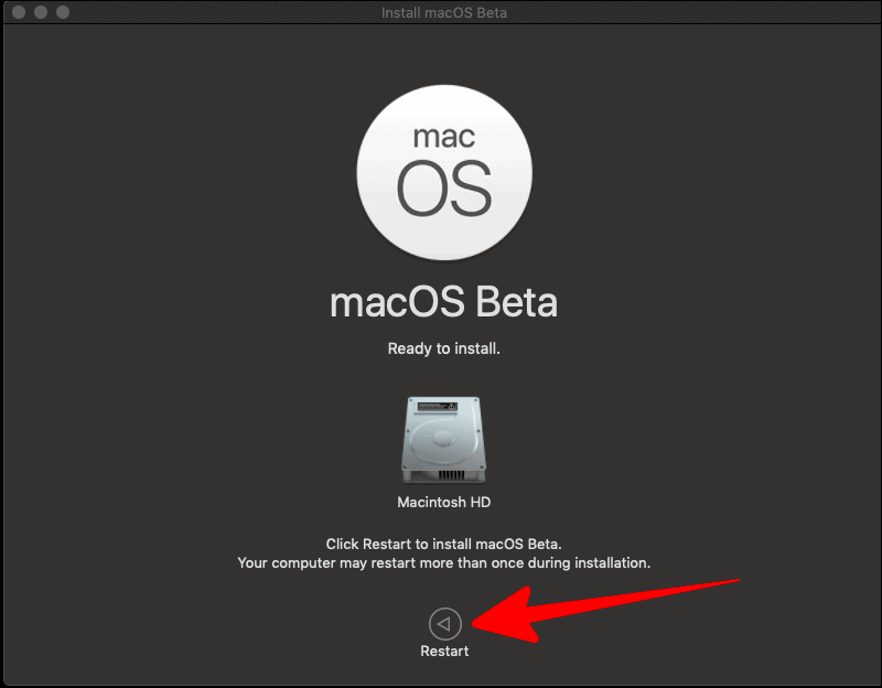 After macOS Beta has been installed on your Macintosh disk, and the software is ‘Ready to Install’, you would have to restart your system for the new upgrade to take the lead. Click on ‘Restart’.