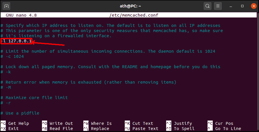 The memcached.conf configuration file will open with the nano editor, look for the -l 127.0.0.1 line in the configuration and replace 127.0.0.1 with your Memcached Server IP or in this instance 192.168.0.5.