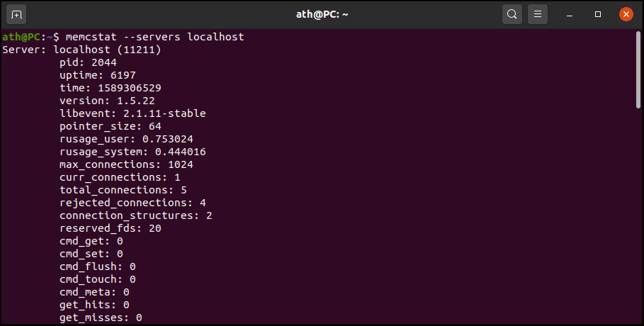 After installation is complete, Memcached daemon starts in the background by itself. To verify installation, we can use a command from libmemcached-tools package to get Memcached server stats. Either run