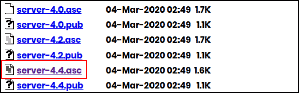 First, import the public GPG key of the latest version of MongoDB. To find the appropriate key, visit this URL and look for the server-x.x.asc file corresponding with the current latest version of MongoDB.