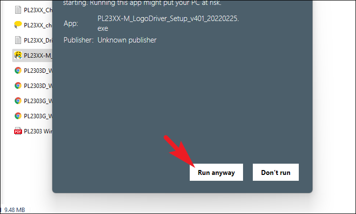 Step 6: Click 'Run anyway' at the bottom of the window to proceed with the installation.