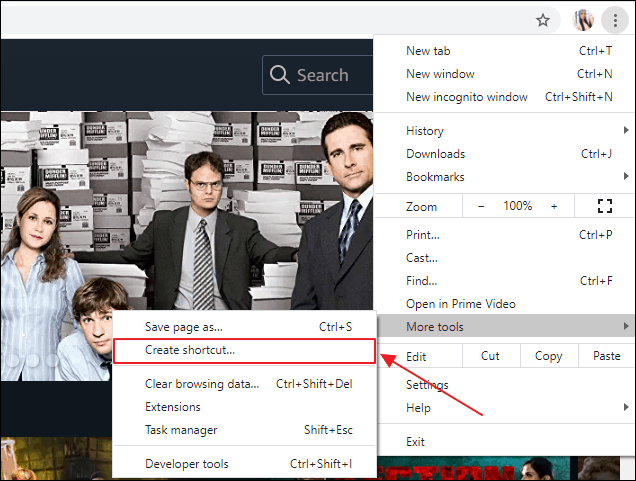 Step 2: In the dropdown menu, hover over More tools and then select Create shortcut... from the submenu that appears.