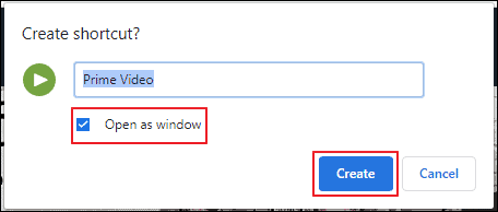 Step 3: A prompt will appear allowing you to name the shortcut. You can keep the default name or enter a new one. Make sure to check the box next to Open as window and then click on the Create button.