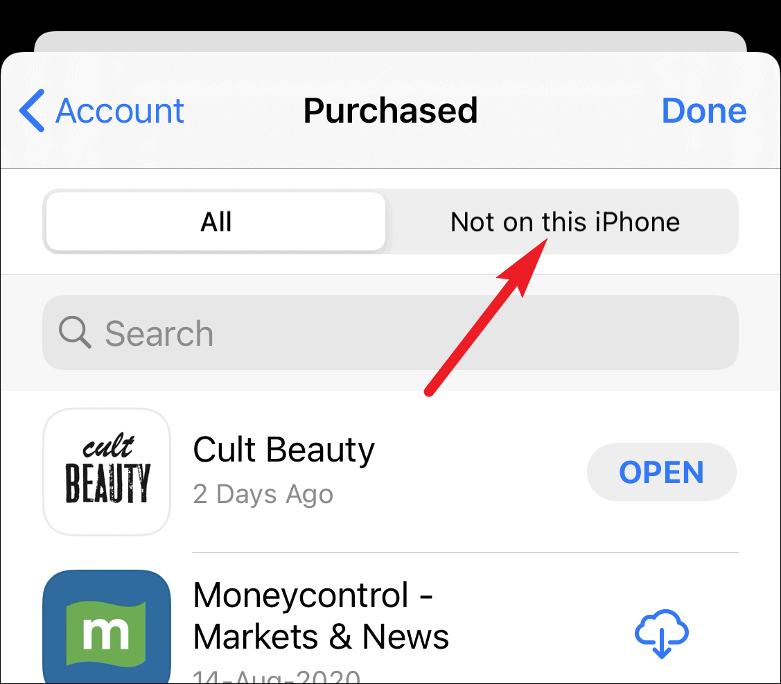 In purchased apps, go to the ‘Not on this iPhone’ tab.