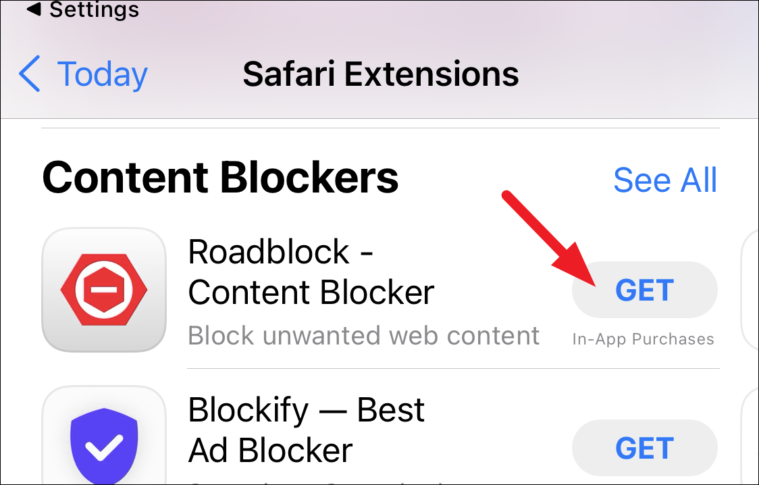 Next, browse and click on the ‘Get’ button present on each individual extension tile to install your desired extension on your iOS device.