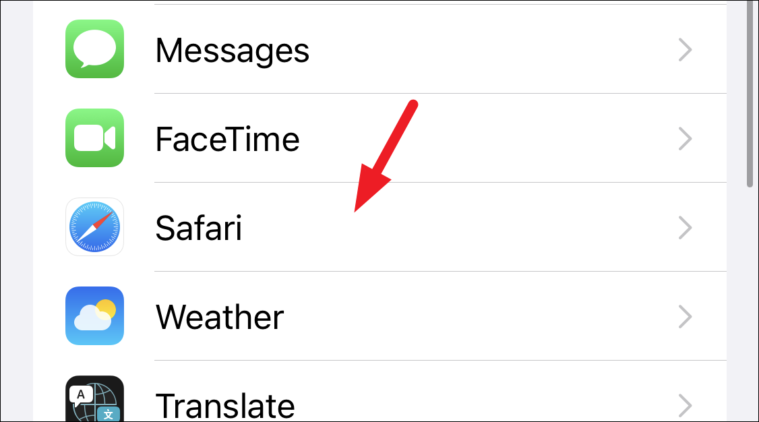 Then, scroll down and tap on the ‘Safari’ tab from the ‘Settings’ screen.