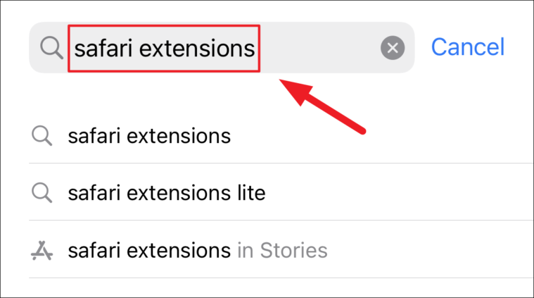 Then, type safari extensions in the search bar present on the top section of your screen and then tap on the ‘Search’ button present on the bottom right corner of the keyboard.