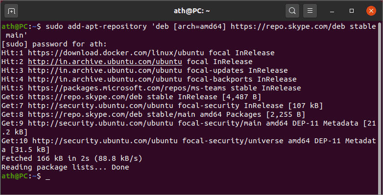 Once the GPG key is added to your Ubuntu system, you can add Microsoft’s Skype repository by running: