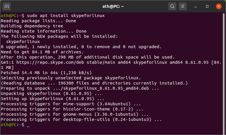 Now you can finally install Skype on your Ubuntu 20.04 system using apt. Update the repositories list for Ubuntu by running the apt update command. The Skype package from Microsoft repository is called skypeforlinux and thus you can install it by running: