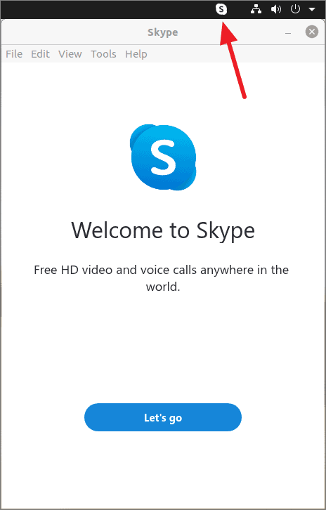 Skype icon will appear in the Ubuntu system tray when launched and run as background application if the window is closed. You can now continue to login to your skype account by clicking on ‘Let’s go’ and start calling your friends and family.