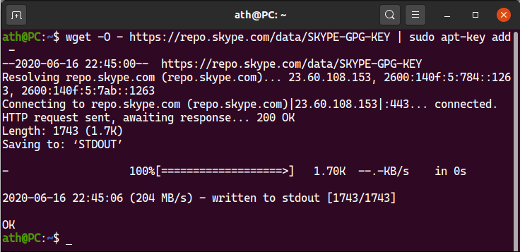 wget -O - https://repo.skype.com/data/SKYPE-GPG-KEY | sudo apt-key add -