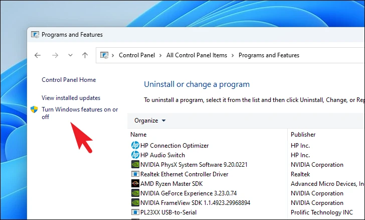 Step 3: On the left sidebar, select 'Turn Windows features on or off'. This will open a new window listing optional Windows features.