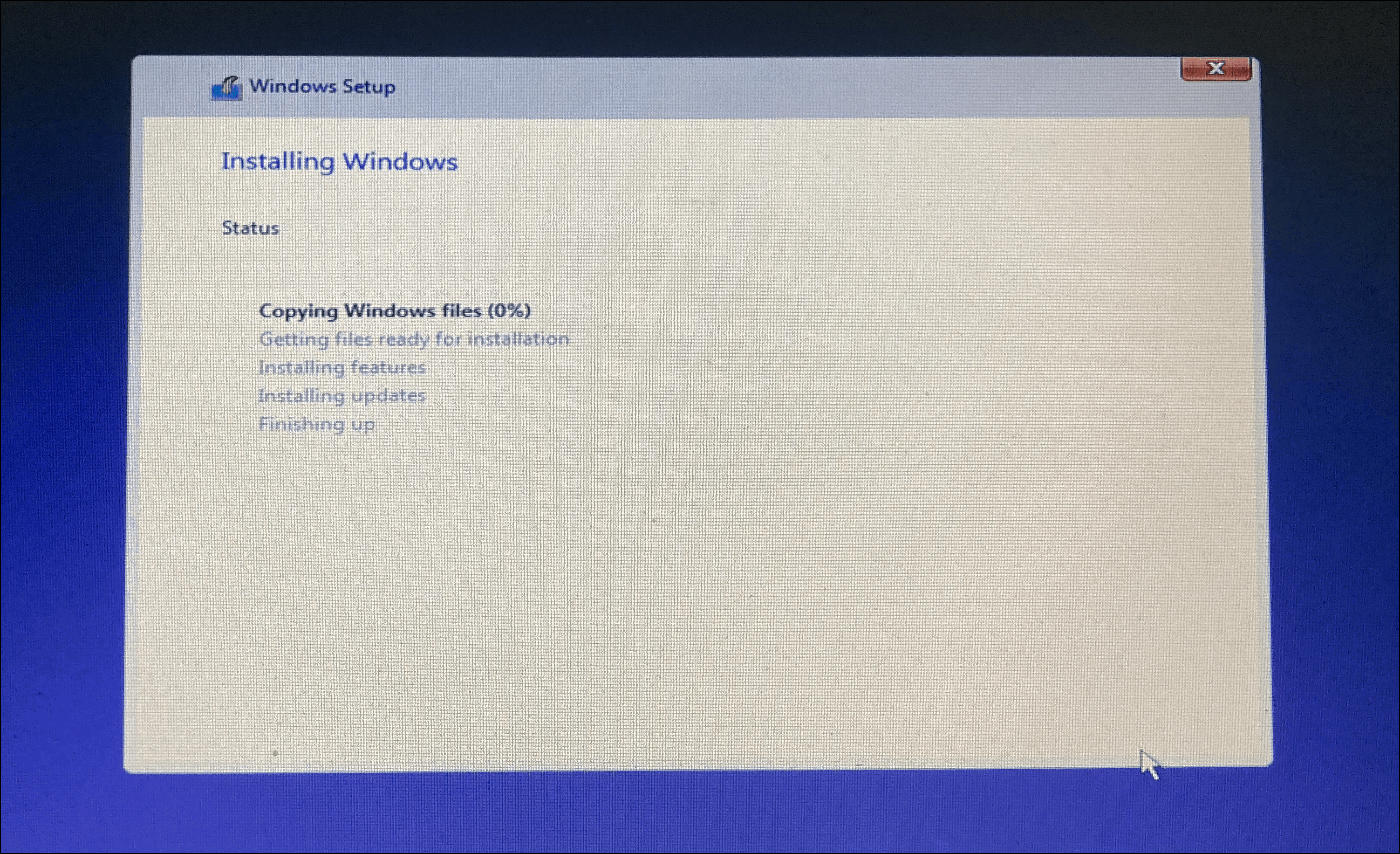 - The installation of Windows 11 will begin. Wait for the process to complete, and ensure the computer remains powered on.