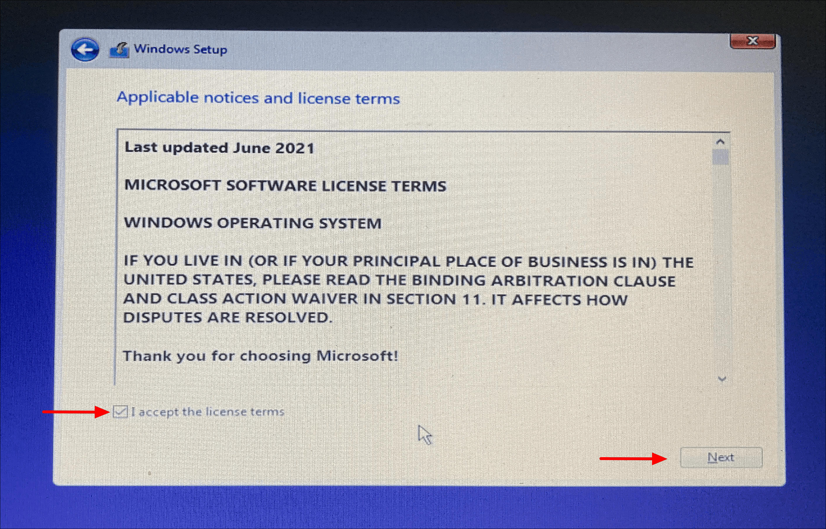 - Read the license terms, check the box for I accept the license terms, and click Next.