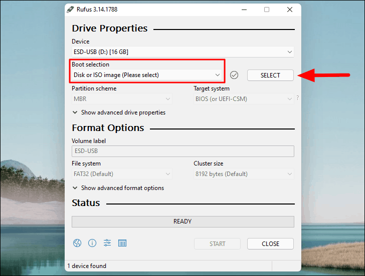 - If you have only one USB drive connected, it will automatically appear under the Device section. If multiple drives are connected, select the correct one from the drop-down menu.
