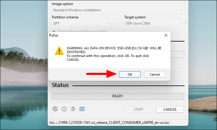 - A warning will appear indicating that all data on the USB drive will be destroyed. Click OK to proceed.