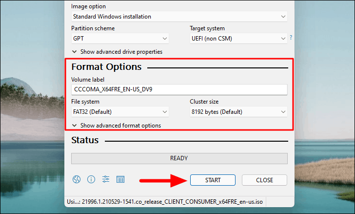 - Keep the default settings under Format Options. You may change the Volume label if you wish. Leave the Show advanced format options as is for a straightforward process. Click START to begin creating the bootable USB drive.