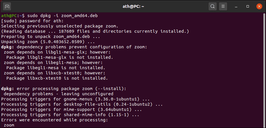 sudo apt install -fOnce the dependencies are installed, Zoom should be successfully installed on your system. You can launch it from the App Launcher or Activities search menu.