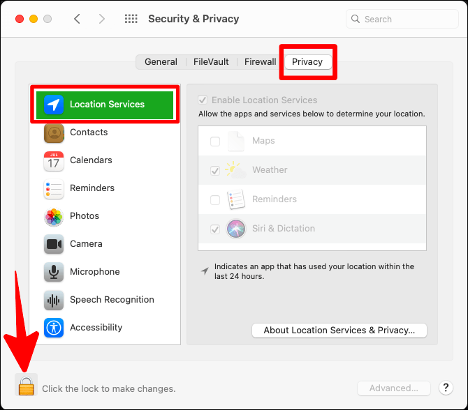 In the ‘Security and Privacy’ settings, select the ‘Privacy’ button. Now, click the ‘Location Services’ on the left side and then click the lock button on the bottom left of the window to unlock the location services changes.